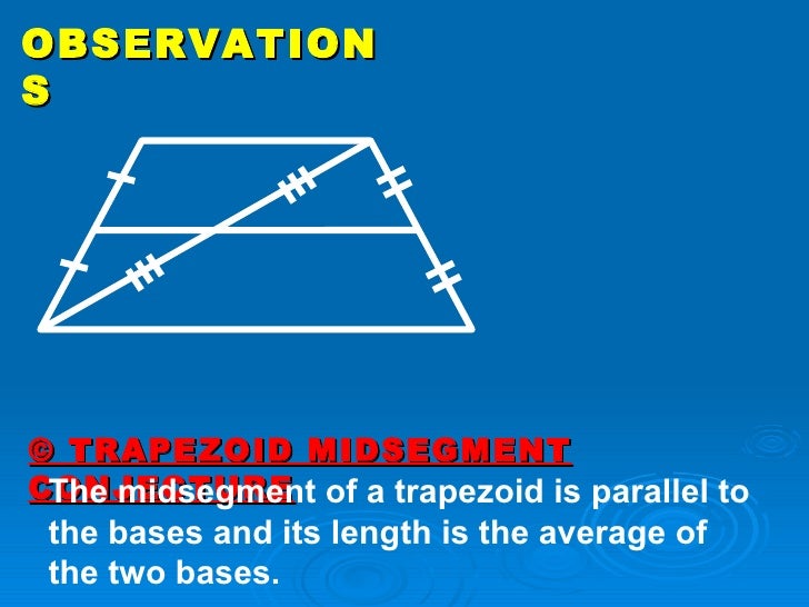 8.5 use properties of trapezoids and kites from image.slidesharecdn.com Half the length of the longer base. The segment closest to the third side of the triangle is the trapezoid midsegment of the trapezoid formed by the third side and the upper parallel segment. F e = 1 2 ( a b + d c) fe=\frac {1} {2} (ab+dc) f e = 2 1 ( a b + d c) the length of the midsegment of a trapezoid is always equal to half of the sum of the lengths of the parallel sides. How to use the midsegment of a trapezoid to solve problems. A trapezoid midsegment connects the midpoints of the two congruent sides of the trapezoid, and is parallel to the pair of parallel sides. The midpoint of the red segment pictured below is the point (a, 2b) (click button below to see). The midsegment of a trapezoid is a line that goes across from any point on one leg to the midpoint of the other leg; The midsegment of a trapezoid is parallel to each base.